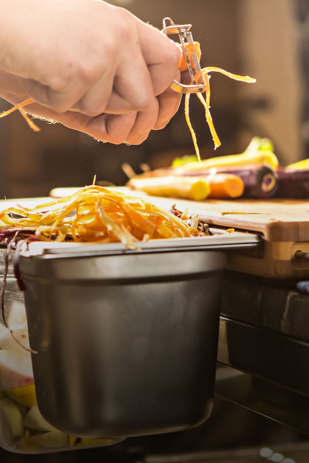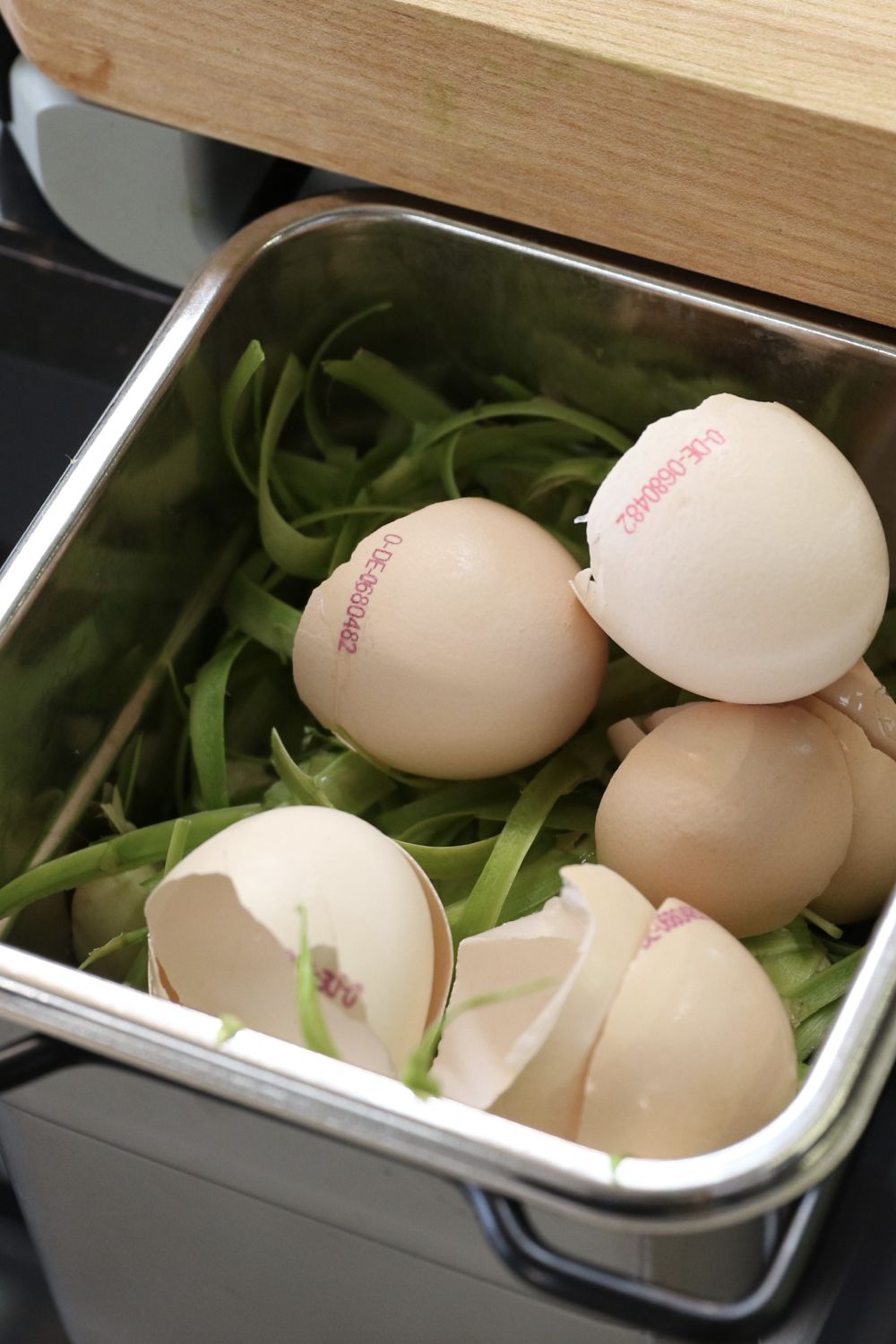 Anfallende Flussigkeit wird effektiv vom umlaufenden Saftrand in den Begrenzungen des Pads gehalten, und indem das Pad leicht angehoben und entlang der unterseitigen Nut in Richtung der Abtropfkante gefaltet wird, kann uberschussige Flussigkeit direkt in den vorderen anhängenden Behälter abgeleitet und dort gesammelt werden.