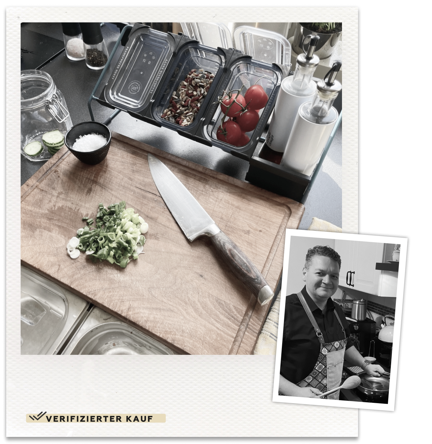 Ich finde es klasse, wie ich meine Zutaten in den integrierten, spülmaschinenfesten Behältern direkt neben dem Schneidbrett aufbewahren kann – kein Hin- und Hergerenne mehr.