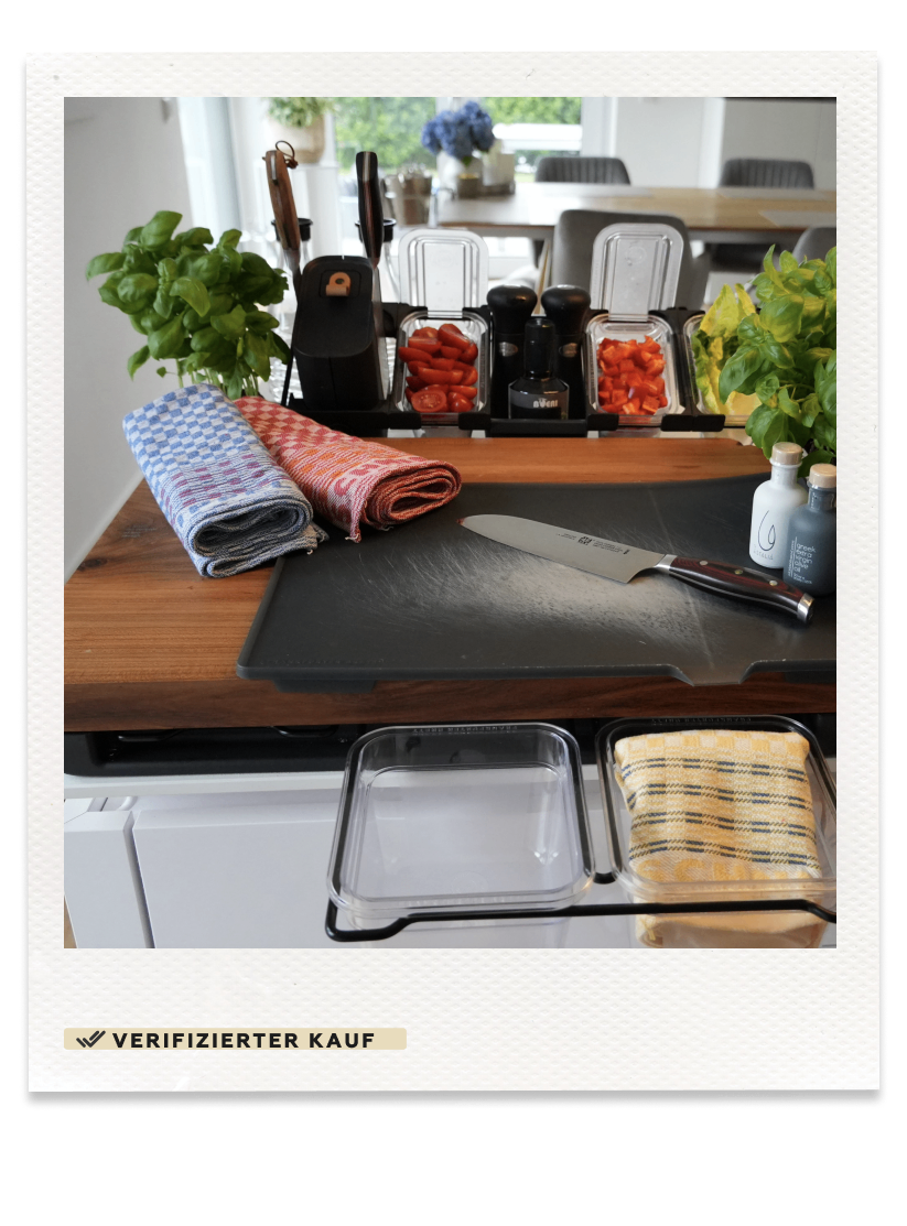 Für das Alltagskochen, meist One-Pot-Rezepte aus einer Kochbox, da reichen Brett, 2 Behälter, manchmal die kleine Schnittstelle.