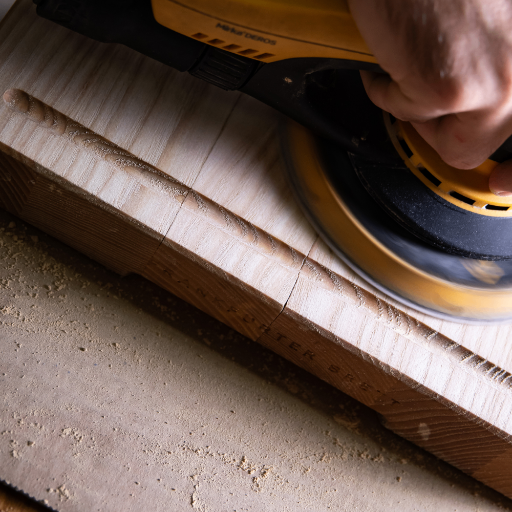 Gravuren werden grundsätzlich überschliffen, um ein ebenmäßiges Holzbild zu erzielen.