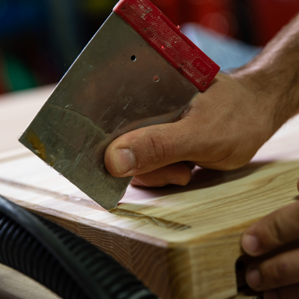 Übermäßig beanspruchte oder in die Jahre gekommene Bretter arbeiten wir fachmännisch wieder auf, schleifen die Oberflächen, spachteln kleine Löcher und Risse und schicken das gute Stück gut geölt und fast wie neu frei Haus zurück - inklusive einer neuen Flasche Brettpflege.