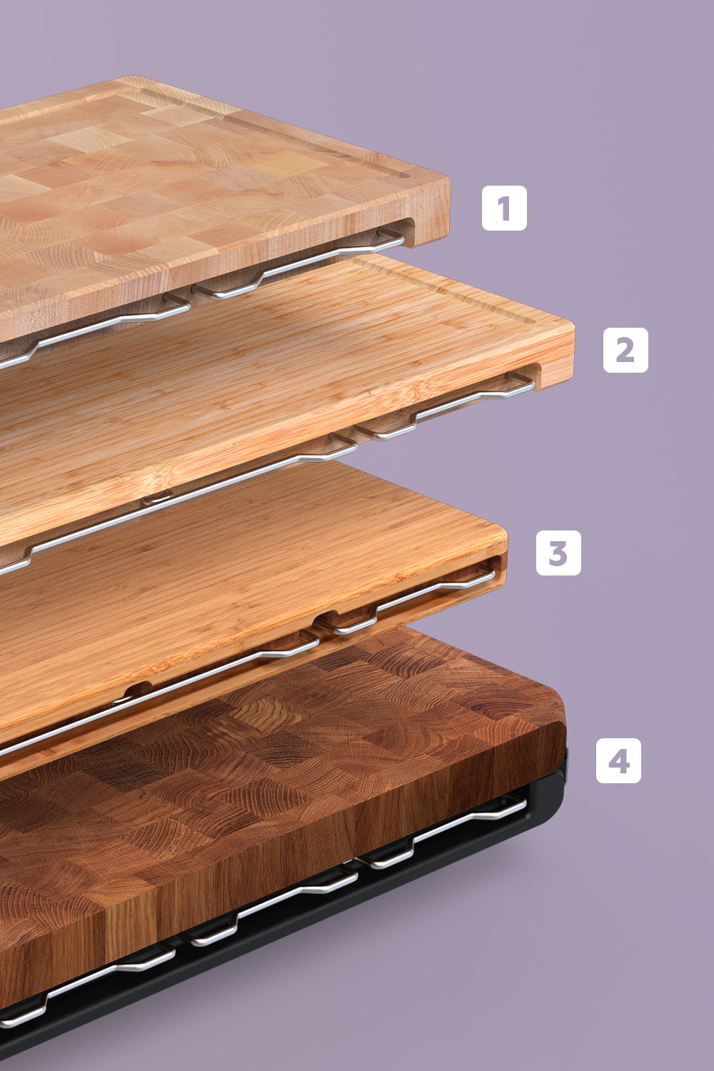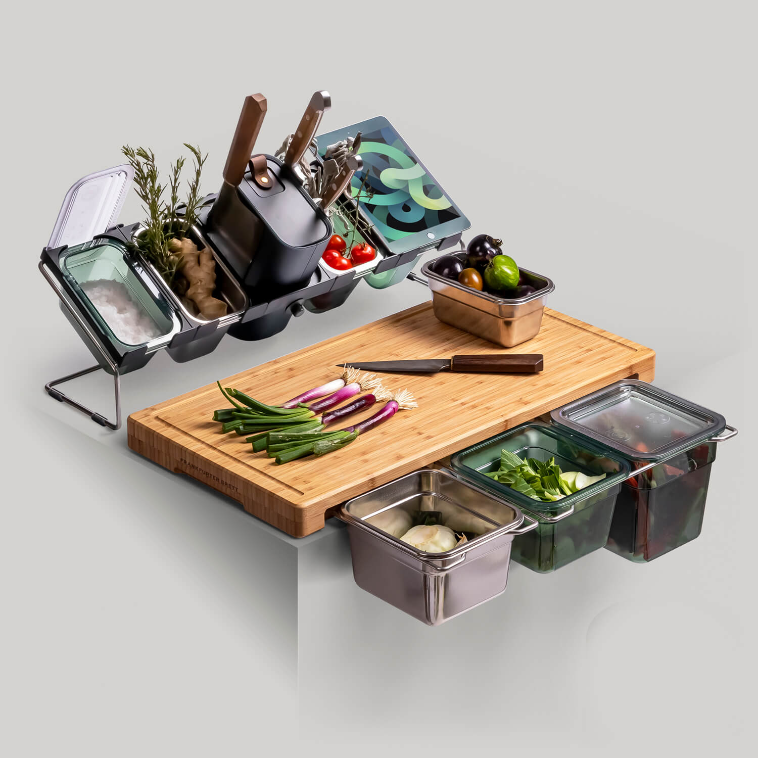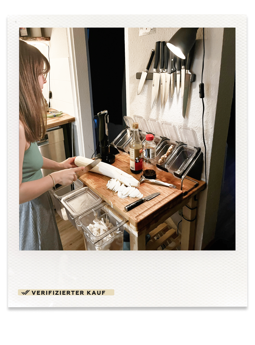 Gerade wenn du nicht genug Platz hast und dich zuvor schon gut organisieren musst ist das System aus Brett, Schneideauflagen, Behälter und auch der Messerblock mit Gestell einfach nur Gold wert."