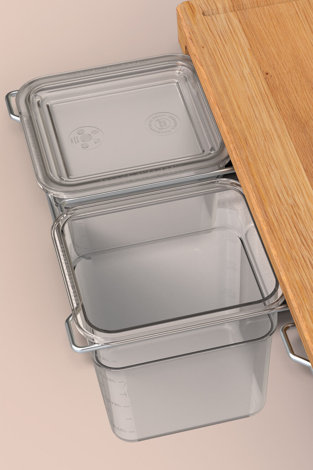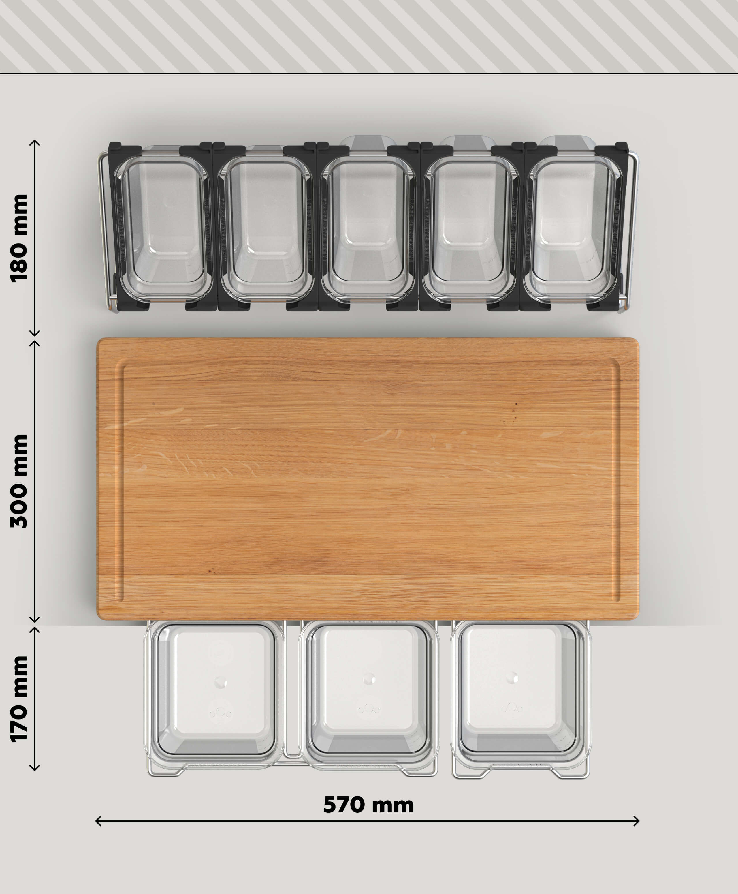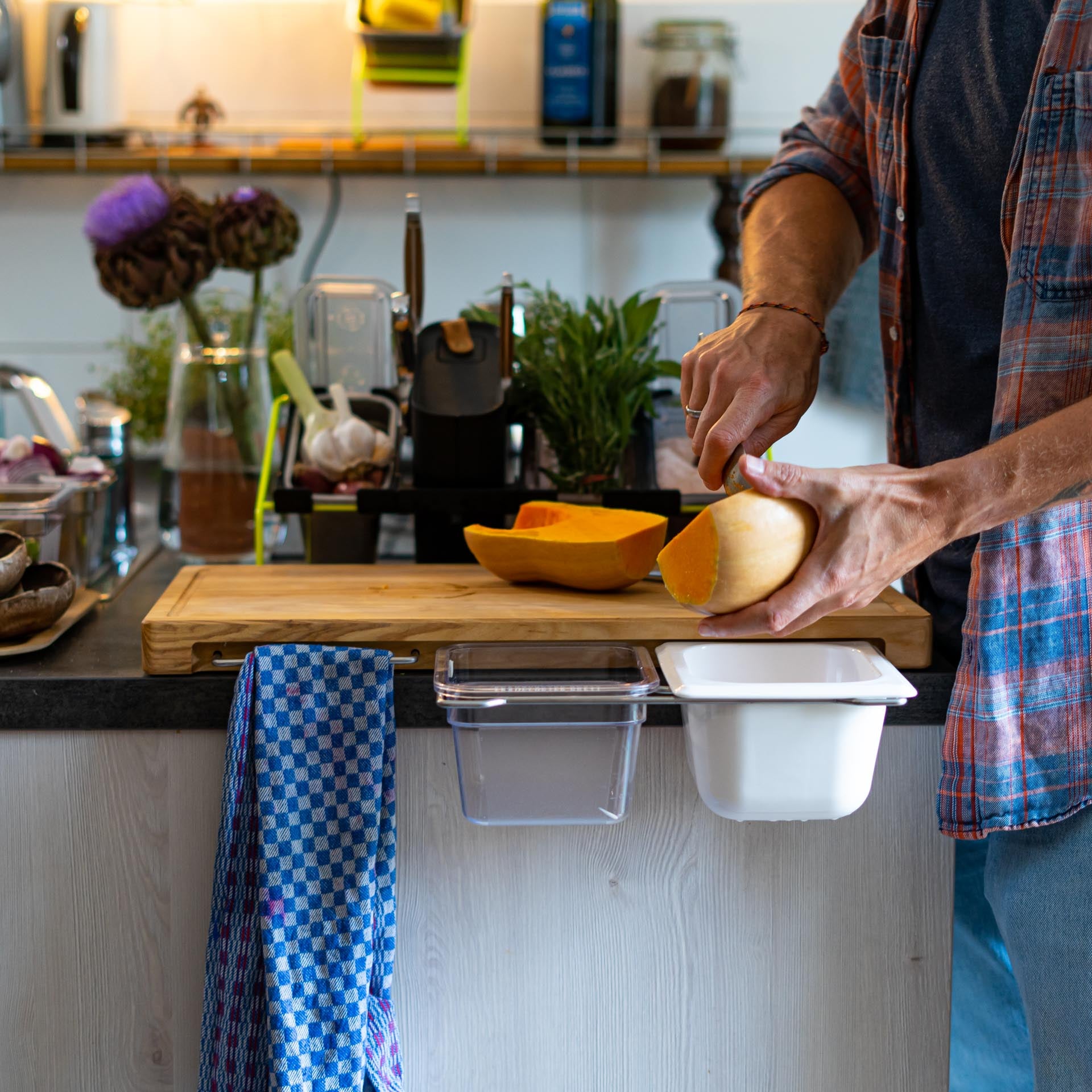 Abfall & Schnittgut verschwinden unmittelbar in die entsprechenden Behälter, anstatt wie bei anderen Brettern die knappe Arbeitsfläche zu blockieren. Der zusätzliche Bügel kann ganz nach Belieben verwendet werden - für einen Werkzeug-Behälter bzw. ergänzenden Lebensmittel-Behälter oder auch für das Küchentuch.