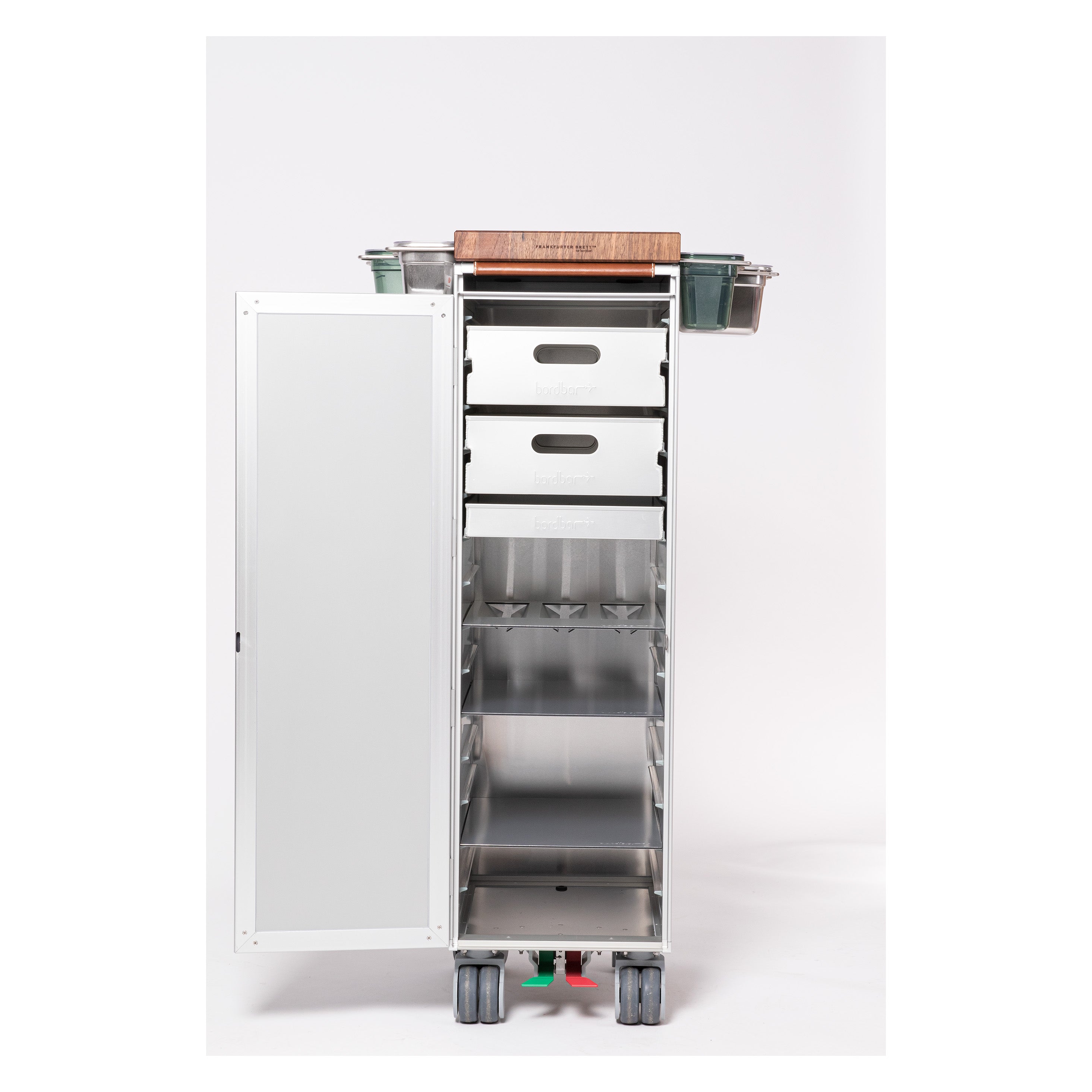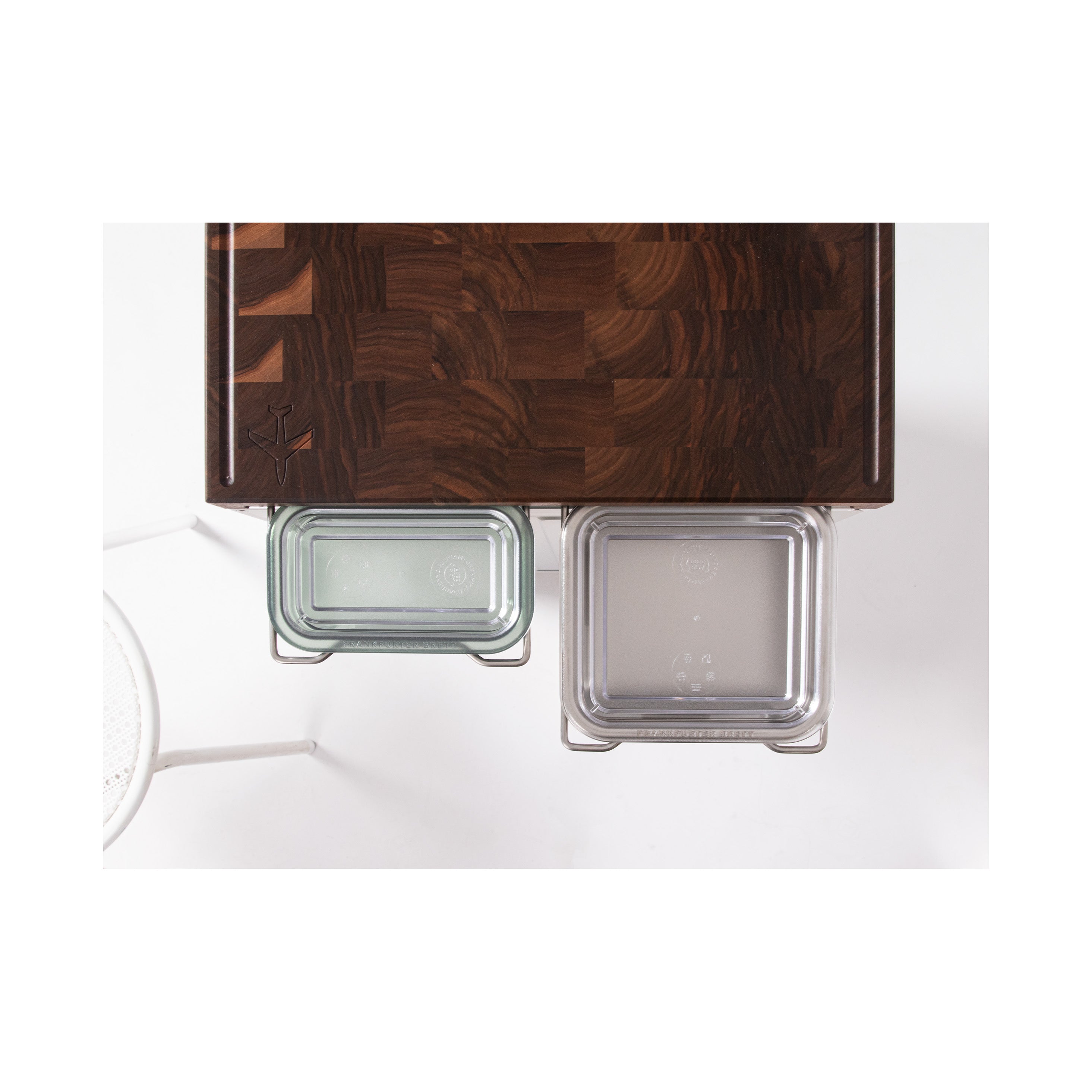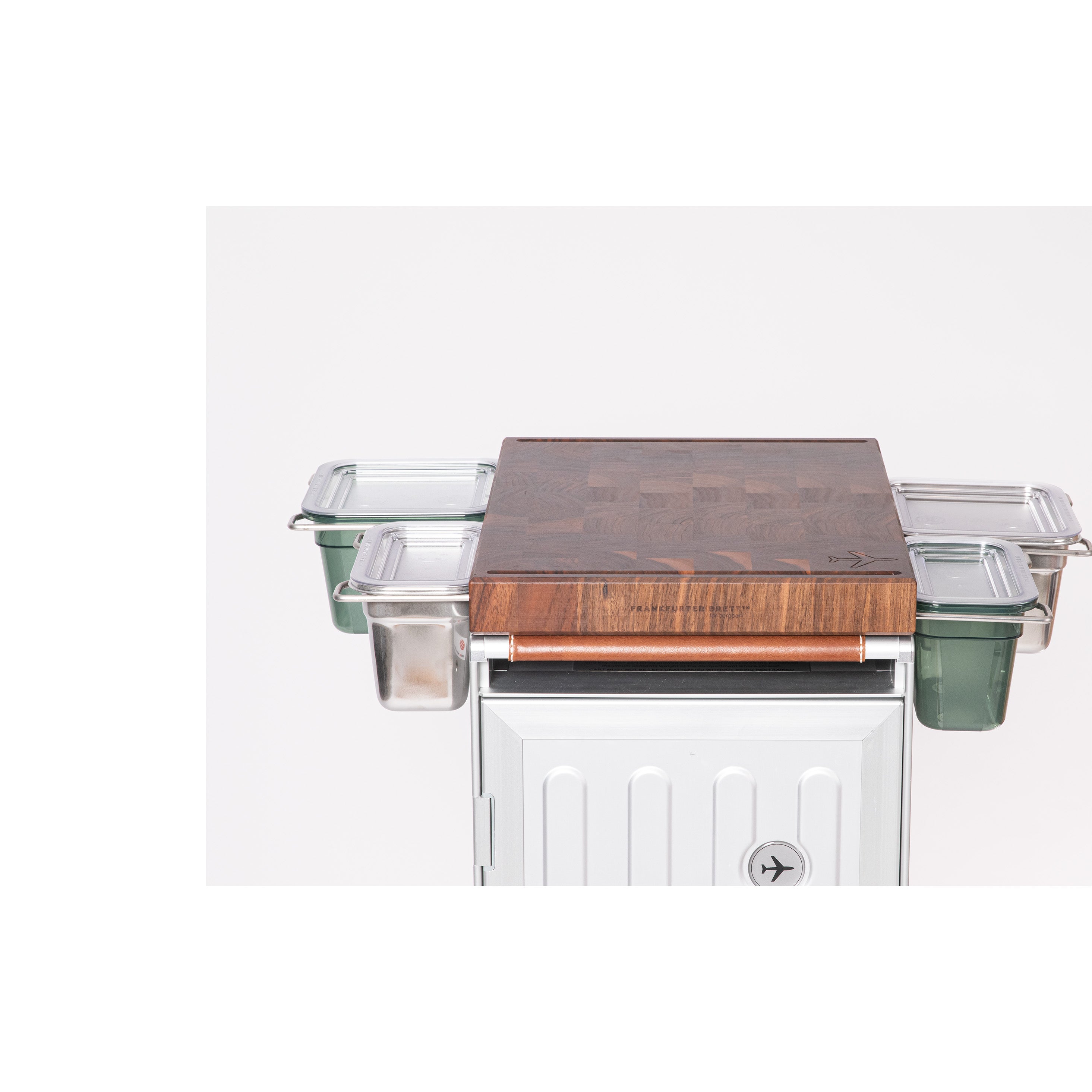 Das Brett sitzt passgenau oben auf dem Trolley auf und nimmt beidseitig jeweils zwei Behälter auf, und kann aber auch ohne Trolley als normales Schneidebrett in der Küche verwendet werden.