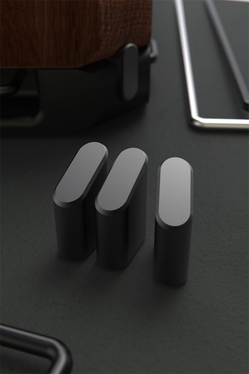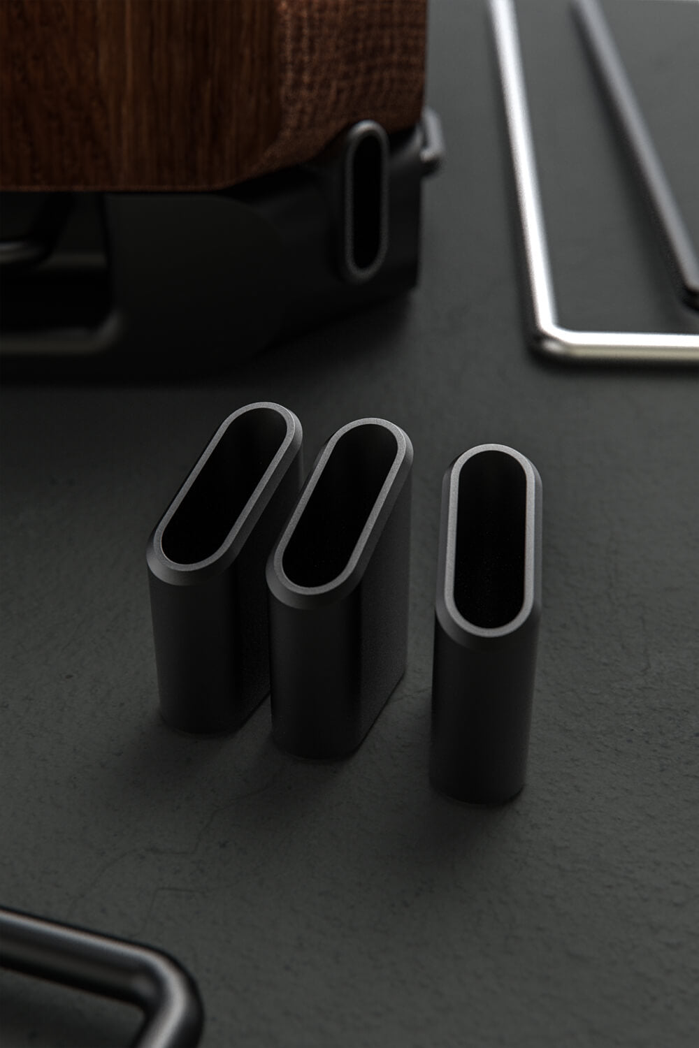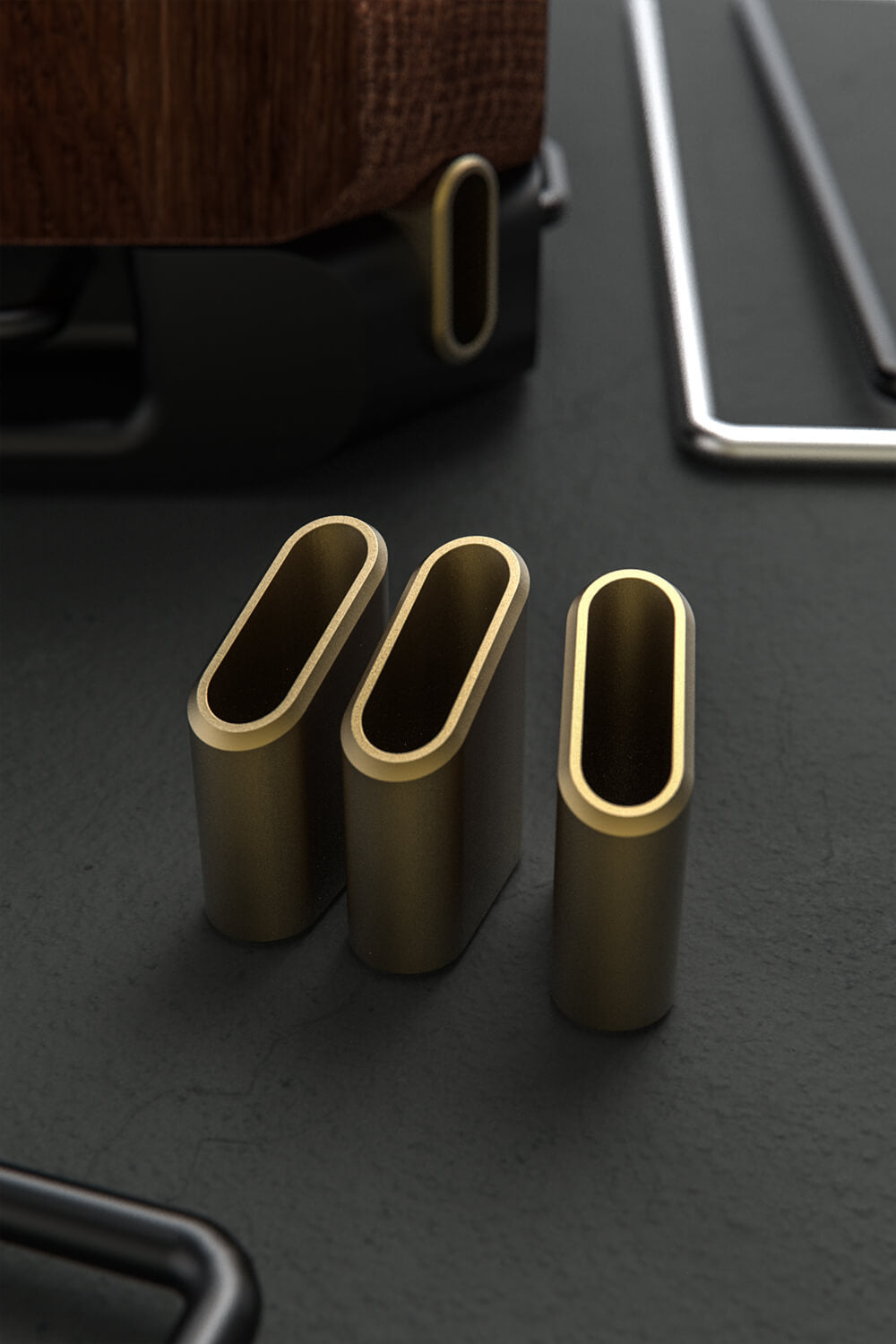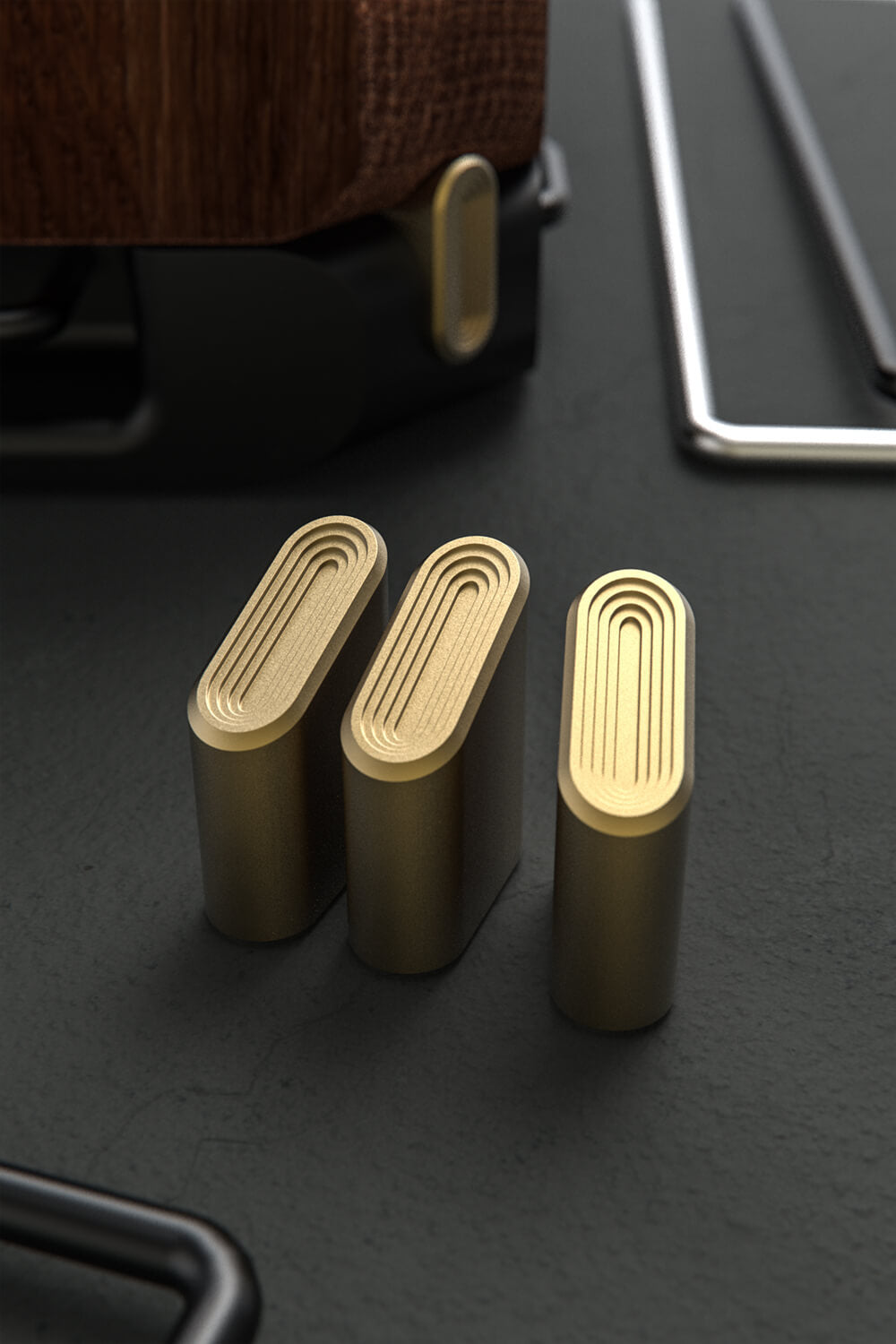 In Offenbacher Fertigung aus dem vollen Material (Messing oder eloxiertem Aluminium) präzisionsgefräst, sind sie nicht nur funktional, sondern richtiggehende Schmuckstücke.